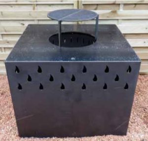 Quadratische Stahl-Feuerschale mit Grillring in beliebiger Höhe.